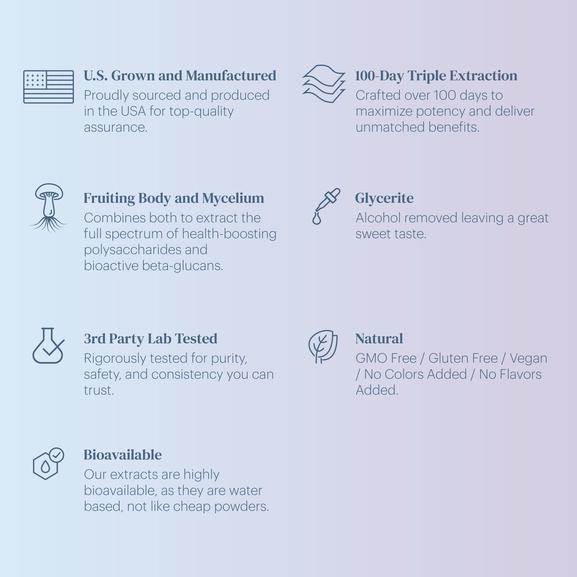 Our water-based extracts for superior absorption of active compounds like polysaccharides and beta-glucans, unlike low-quality powders.