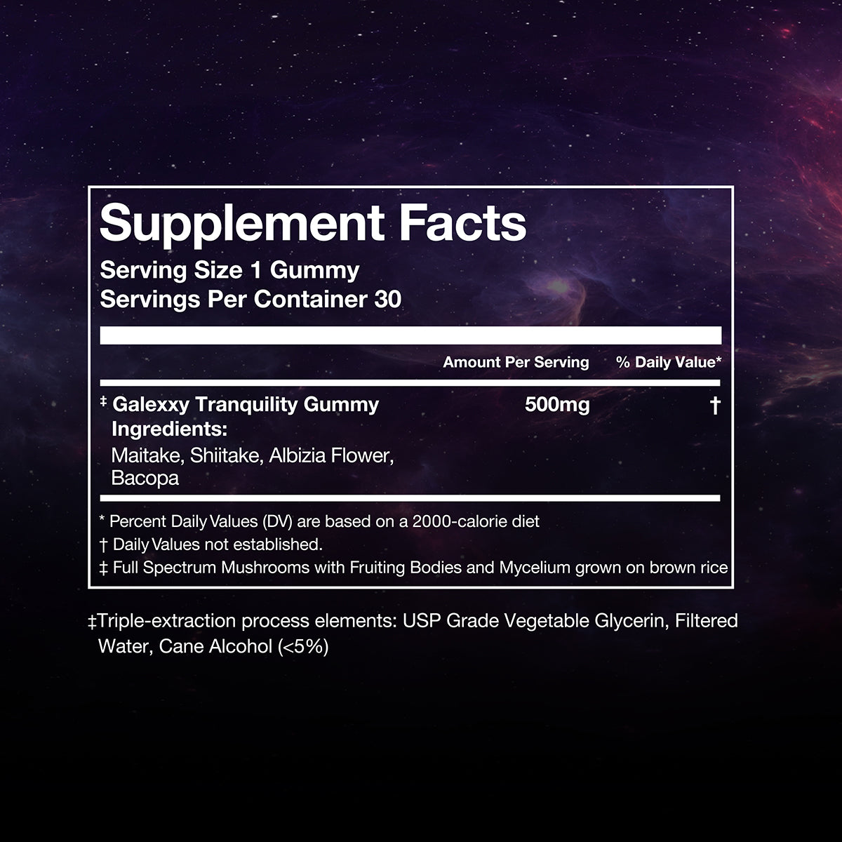Galexxy’s Tranquility, a scientifically crafted blend of functional mushrooms and natural adaptogens, promotes inner peace and relieves anxiety, fostering a serene, calm state. It enhances cognition, clears brain fog, reduces stress, and supports deep, restful sleep, helping you wake refreshed and ready to tackle the day.