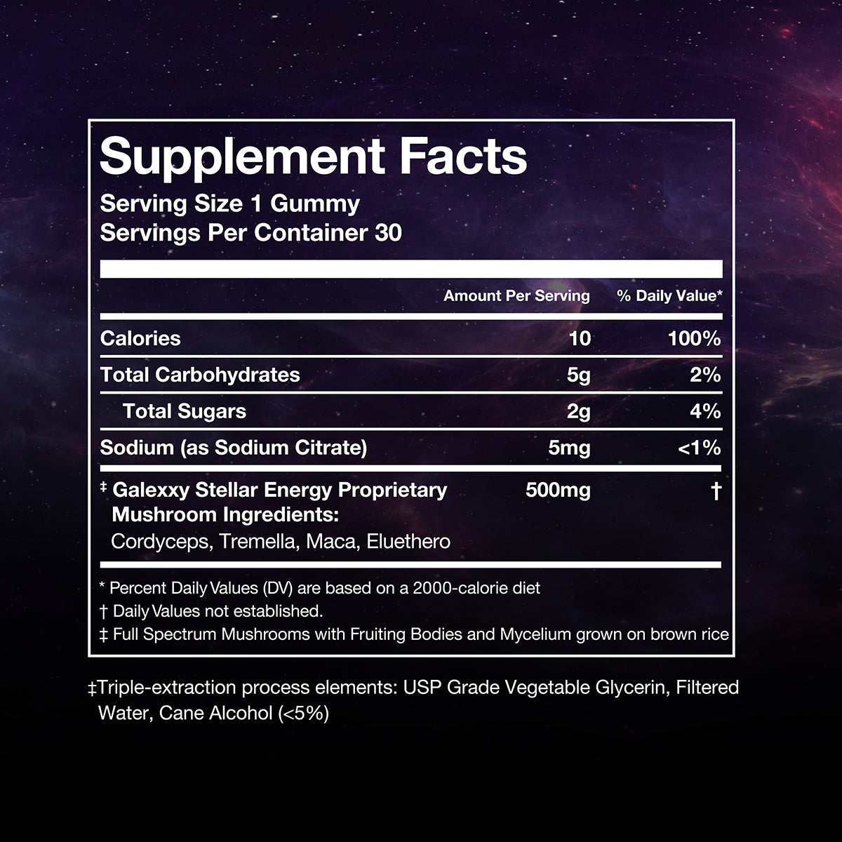 Stellar Energy is your natural rocket booster on the go ready to launch your energy levels in literally minutes. Galexxy’s daytime energy blend is delivered in chewable gummies that give an energy boost lightyear fast.
